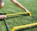 Wechseln Sie zwischen Koordinationsleiter und 10 cm hohen Hürden.